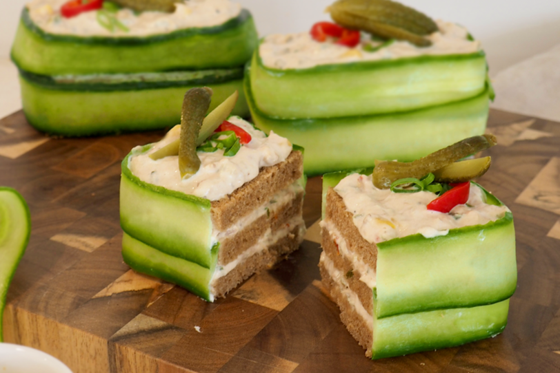 5. Klä bakelsen med gurka och fäst med en tandpetare på baksidan (Tips: för att få gurkan att fästa bättre kan du bre ett tunt lager färskost på gurkskivorna)