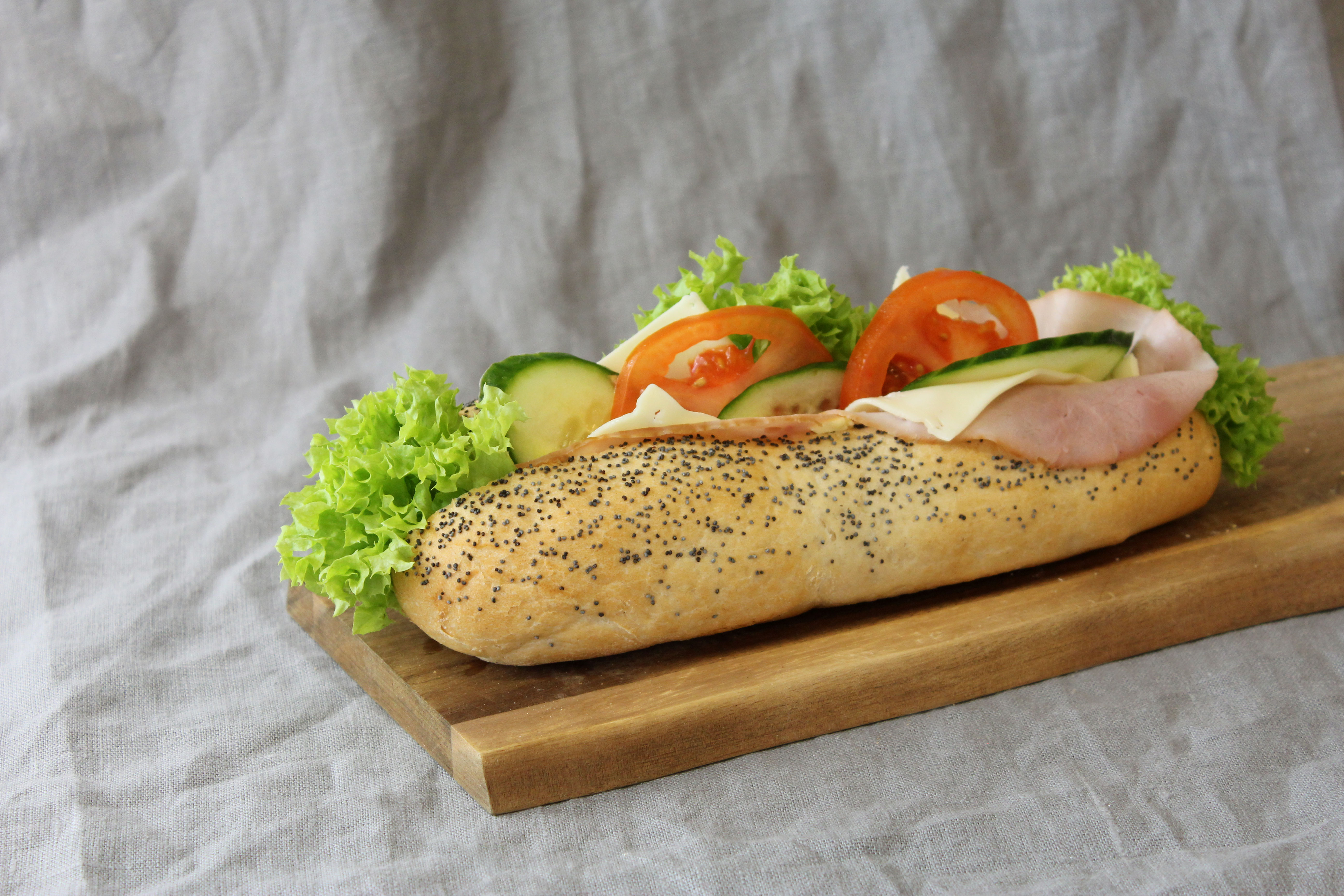 VETEmjöl, vatten, skinka (Helmuskelskinka (90%), vatten, salt, maltodextrin, stabiliseringsmedel (E407, E450, E451), antioxidationsmedel (E301,E331), konserveringsmedel (E250), rökarom), tomater, ost mild (MJÖLK, salt, syrningskultur, vegetabilisk ystenzym), lättmargarin original (ingredienser: vatten, vegetabiliska oljor (raps, solros), kokosolja, modifierad stärkelse, salt (1,5%), emulgeringsmedel (mono- och diglycerider av fettsyror, lecitin), beredning av bondböna, konserveringsmedel (kaliumsorbat), surhetsreglerande medel (mjölksyra), naturlig arom, vitamin (A, D)), gurka färsk, jäst, vallmofrö, KORNmalt, bagerisalt:(salt(NaCl),min98%, klumpförebyggande medel E535/E500), rapsolja, Lecisoft fri:(VETEmjöl, socker, enzym.), huvudsallad, Mjölbehandlingsmedel (E300).ost/skinkbaguette 14% Skinka, 11% Ost.