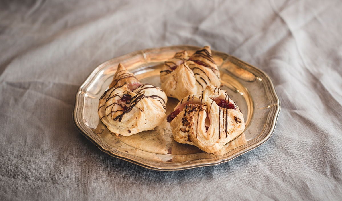 Innehåller naturligt förekommande socker och sötningsmedel.VETEmjöl, vatten, vegetabiliskt fett (palm), sylt ( maltitol, hallon (30%), vatten, förtjockningsmedel (E401, E440), surhetsreglerande medel (E330, E333, E331), konserveringsmedel E202, arom), rapsolja, VETEgroddsolja, konditorimargarin palmfritt (emulgeringsmedel (E471, E322), emulgeringsmedel (E475), färgämne (E160a), naturlig arom, rapsolja, salt 1,2%, surhetsreglerande medel (E330), vatten, vegetabiliskt fett (palm, kokos)), KORNmalt, citronjuice, salt, osötad choklad (kakaomassa, maltitol, kakaosmör, emulgeringsmedel (E322 (SOJA)), aromämne (vanillin), Kan innehålla spår av NÖTTER, MANDEL, MJÖLK), MANDEL, Mjölbehandlingsmedel (E300).